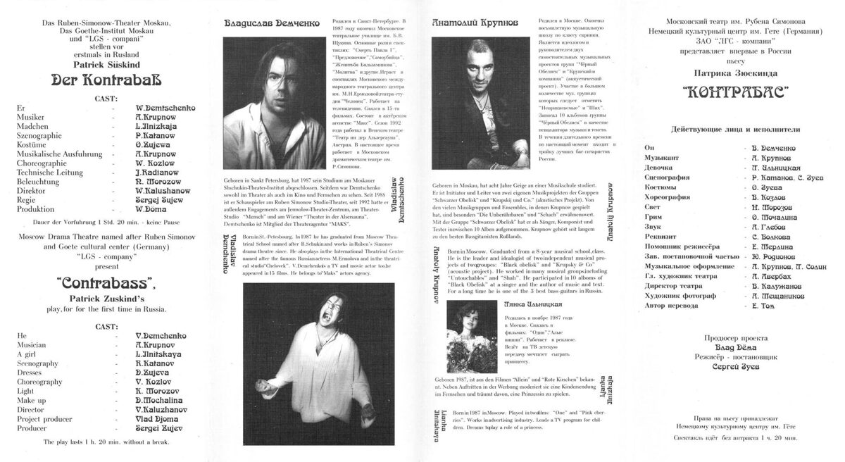 Спектакль по пьесе Патрика Зюскинда был впервые поставлен в 1995 году на Московской сцене театра им. Рубена Симонова режиссёром Сергеем Зуевым. Роль альтер-эго контрабасиста впервые исполнил, а также написал и сыграл всю музыку к действию рок-музыкант Анатолий Крупнов. Главную роль исполнил актёр Владислав Демченко. В эпизоде сыграла молодая актриса Лянка Ильницкая.
